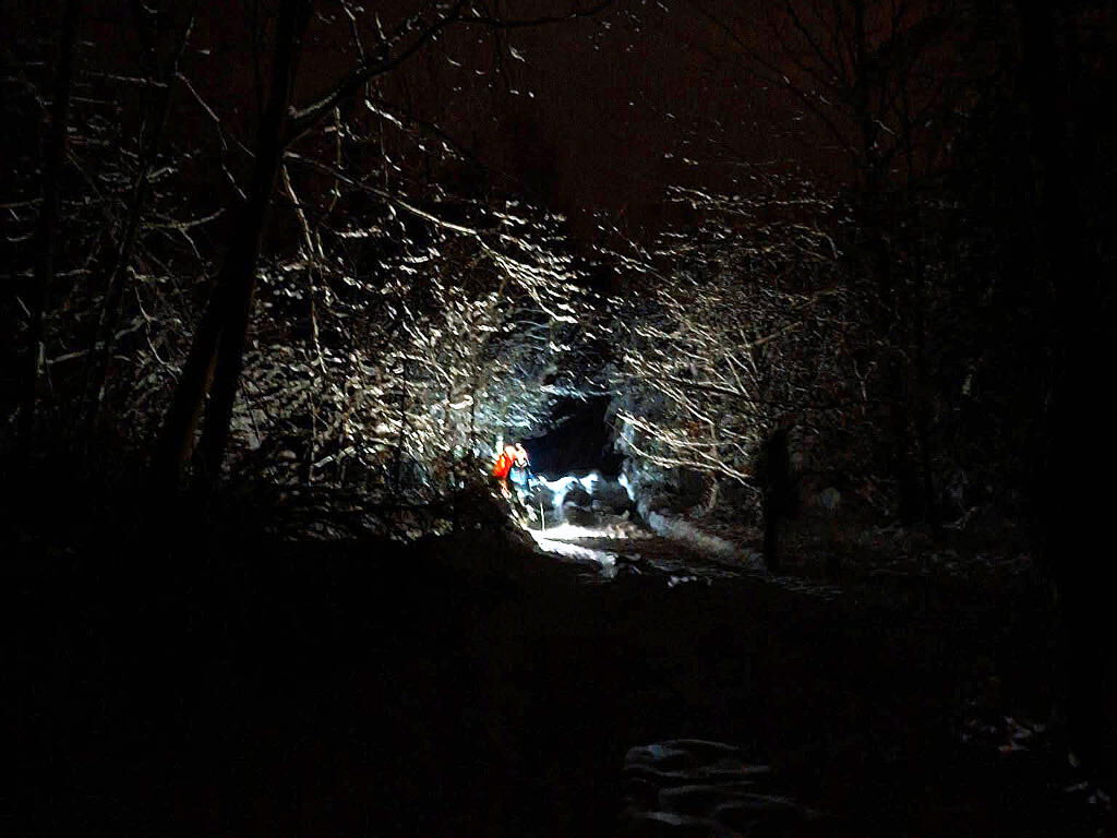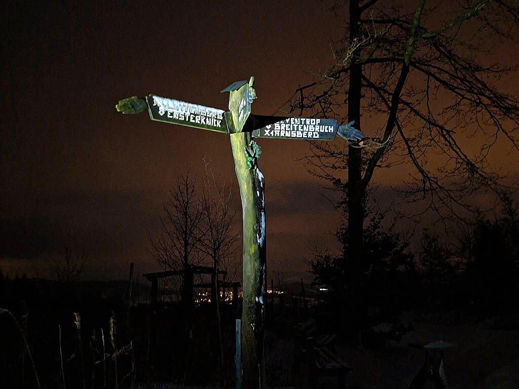 Nach der Einkehr bei Frau Schürmann auf dem Lattenberg steigerte sich das Winter-Erlebnis im Arnsberger Wald durch die Veränderung der Wahrnehmung im Dunklen: Schärfung der Sinne Sehen, Hören und Fühlen des Schnees unter den Füßen; ein beglückendes Naturerlebnis in wilder Landschaft - mit Blick vom Plackweg aus auf die Lichter der Zivilisation.